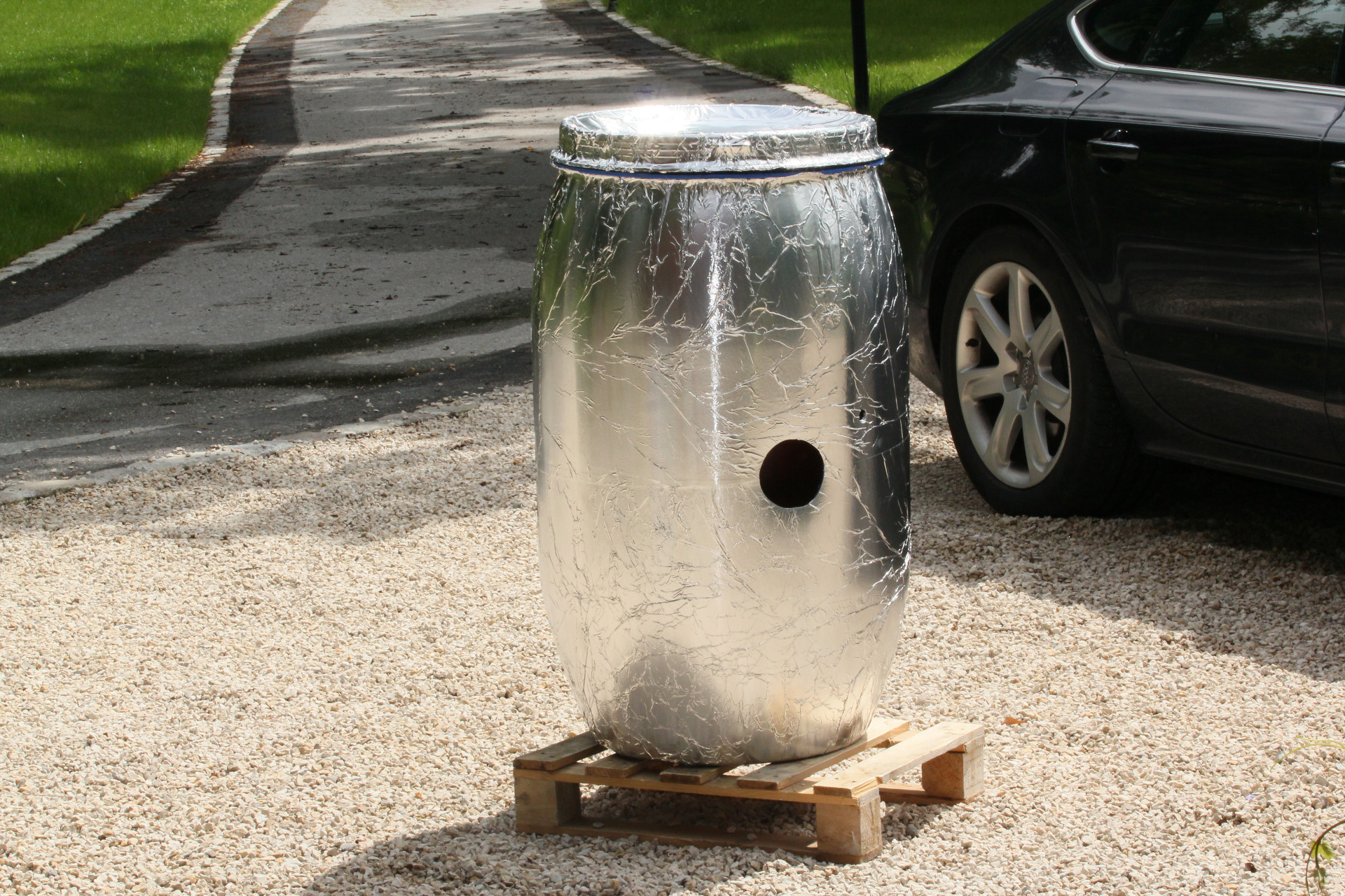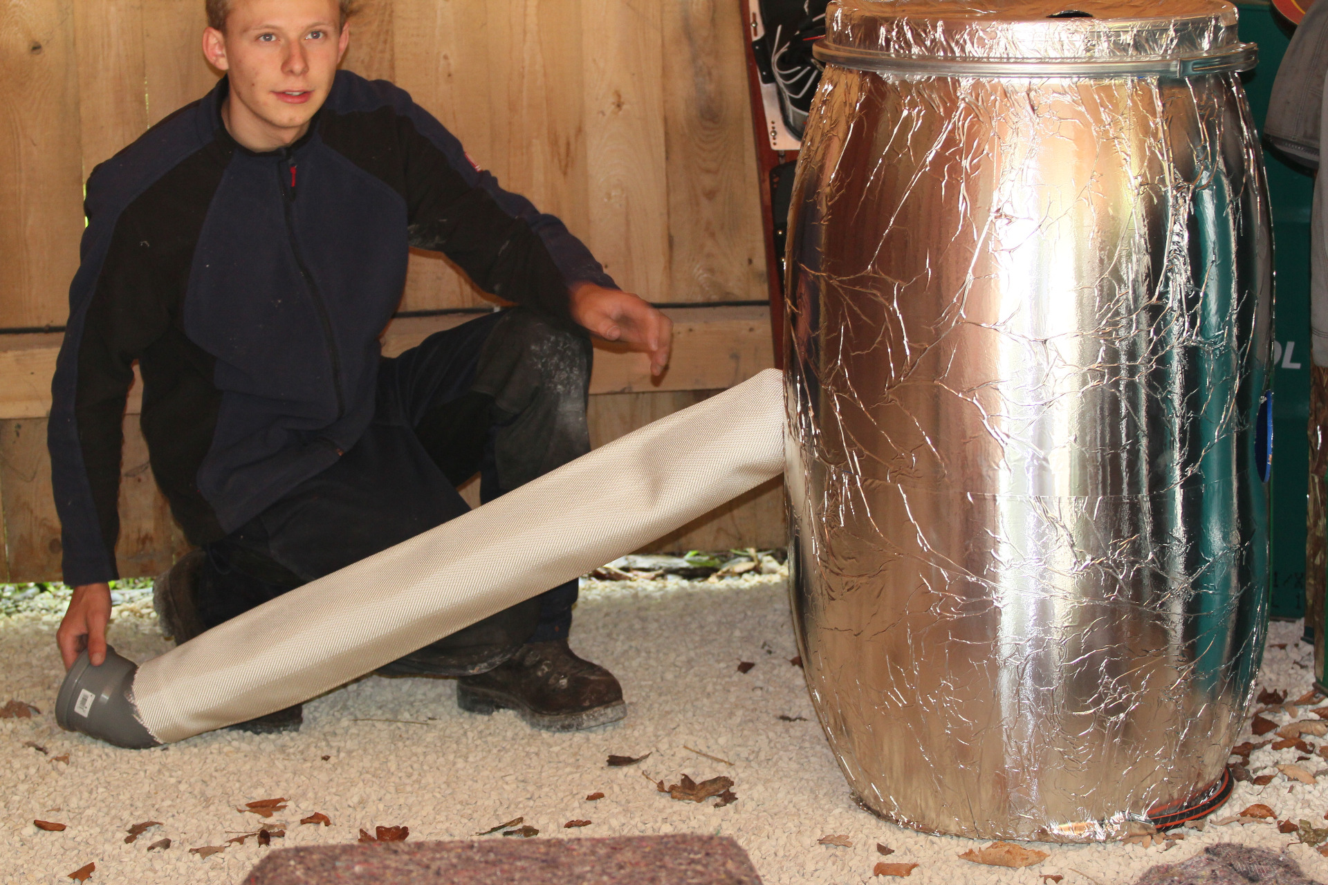 Nach gründlicher Reinigung besprühten wir das Fass und die Industriealufolie mit Sprühkleber und schafften somit eine dauerhafte Verbindung von Fass und Folie.